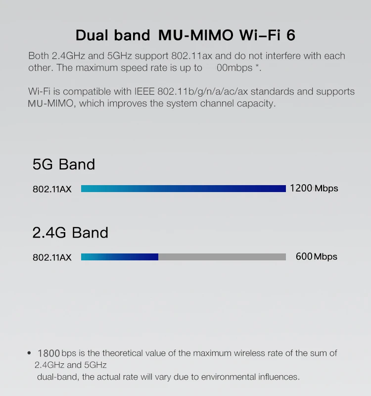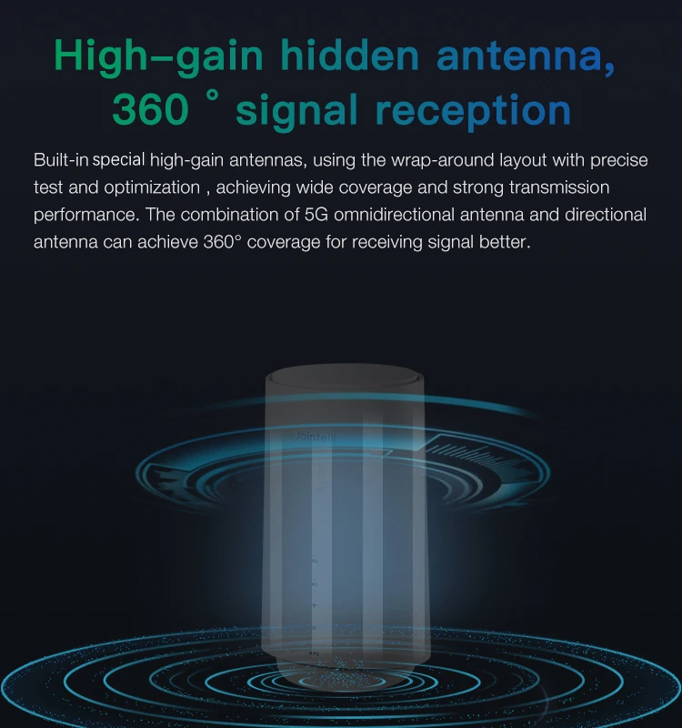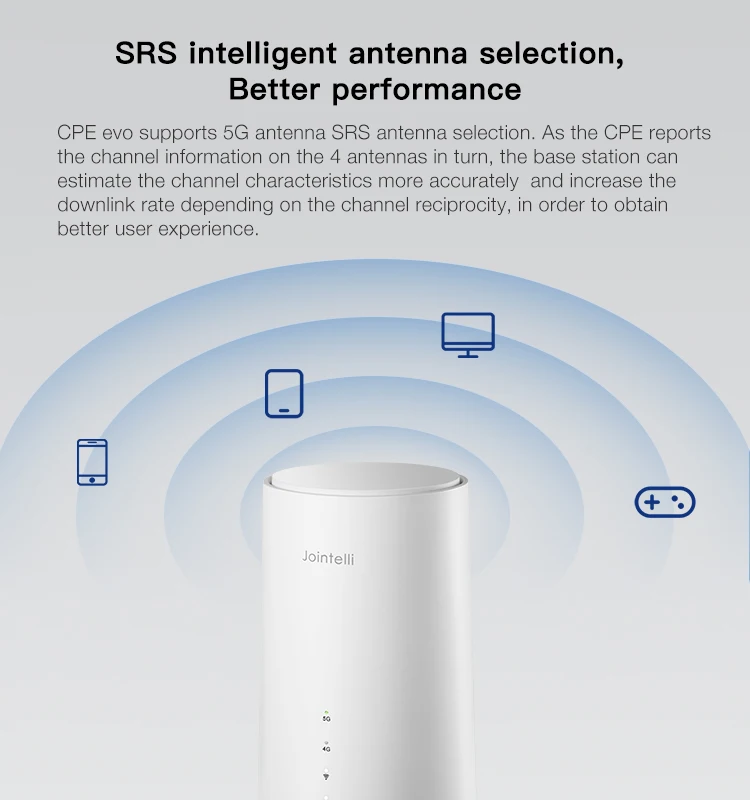 The Jointelli 5G CPE Evo AX3600 is a powerful unlocked indoor 5G router built on the MediaTek T750 platform with a Quectel RG500L 5G module, delivering theoretical download speeds of up to 4.67 Gbps on Sub-6GHz 5G NR. Its WiFi 6 (802.11ax) dual-band radio combines 574 Mbps on 2.4 GHz and 1200 Mbps on 5 GHz for a combined AX3600 wireless throughput, supporting up to 128 connected devices simultaneously with OFDMA and MU-MIMO. Featuring automatic 5G NSA/SA network switching, band locking, three Gigabit Ethernet ports, and WPA3 security, the Evo AX3600 is equally at home as a primary broadband router or a high-speed internet backup. Simply insert any nano SIM card and connect — no ISP engineer visit required. Compatible with all major 5G and 4G LTE networks worldwide.